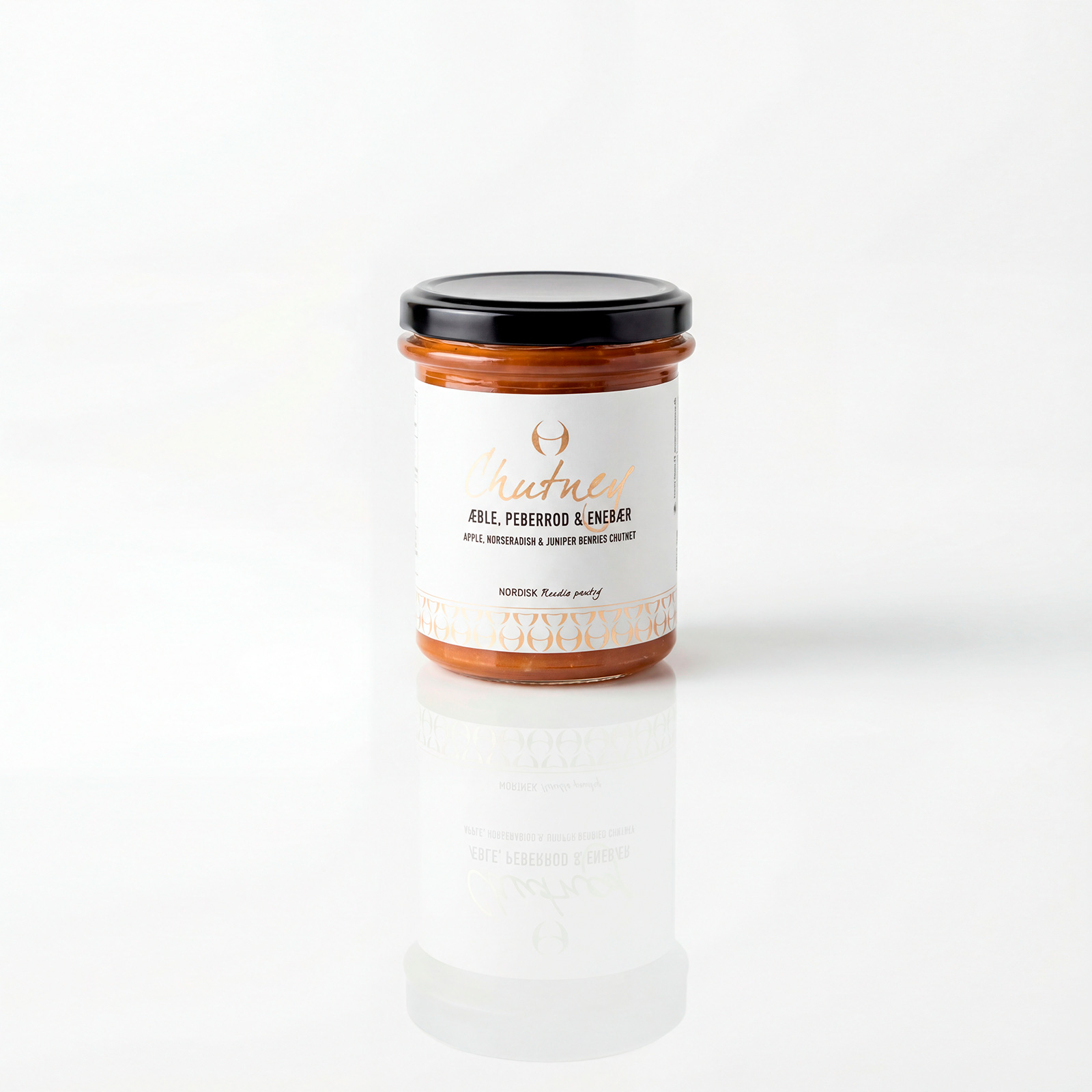 Chutney er en krydret marmelade, denne variant er med æbler, peberrod og enebær.